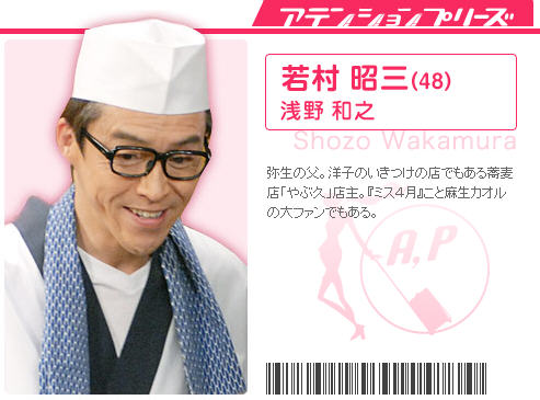 若村昭三介绍:弥生的爸爸。荞麦面馆老板。非常喜欢四月小姐麻生薰