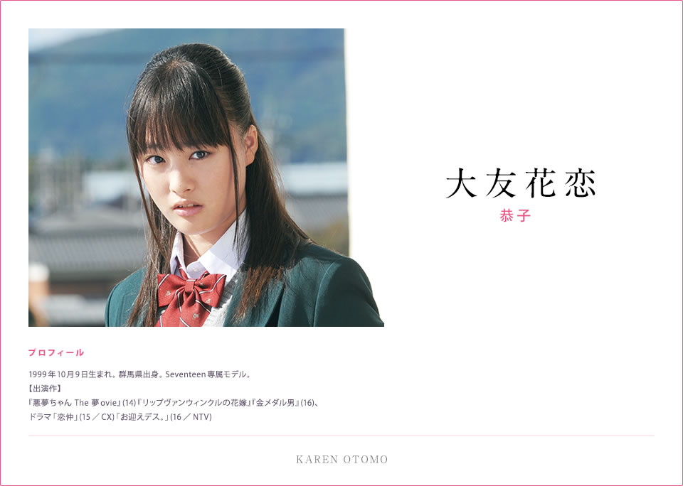 恭子介绍:从初中起就是樱良的密友,非常关心樱良。正因为过于关心好朋友,所以对突然与樱良关系亲近起来的“我”怀有警戒之心。