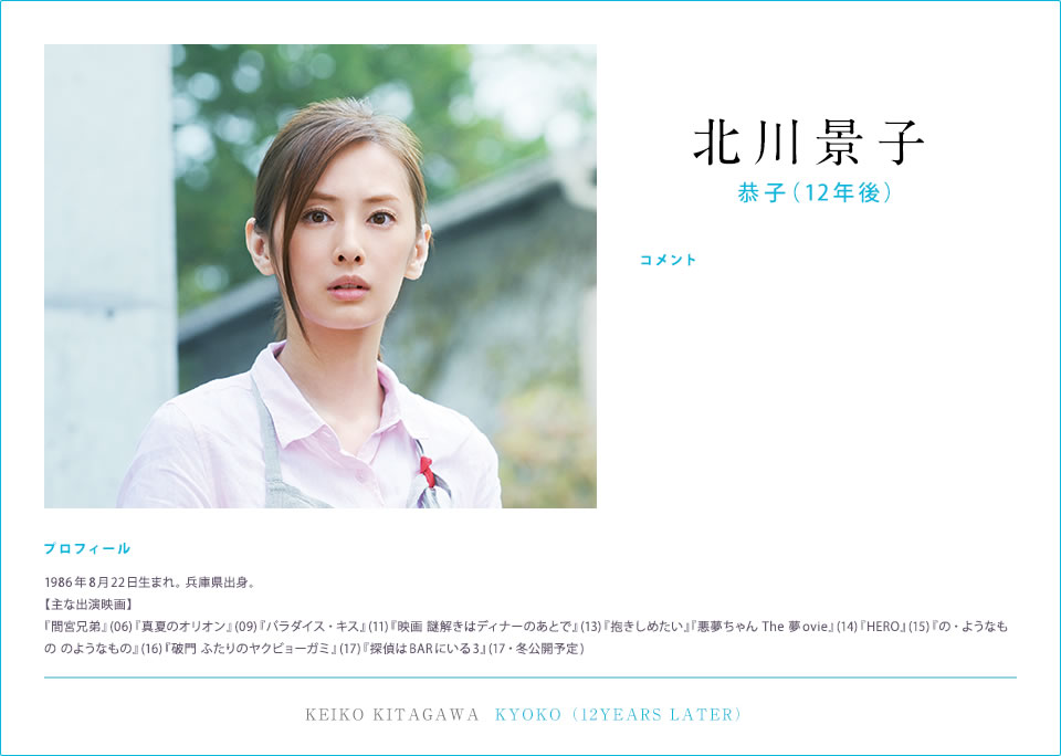 恭子介绍:长大后在父母开的花店工作,目前即将举行婚礼。因为失去好友樱良而产生的失落感一直萦绕在心头挥之不去,至今仍珍视着樱良留下的耳环。