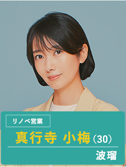 真行寺小梅介绍:知识丰富,善于观察,是大型公司GlobalstellarDhome的王牌业务员,因为某种原因快三十岁时突然转职到几乎都是男人的“丸福工务店”。她真诚对待顾客,做事非常努力,但是又有点笨拙,不会直白表达自己,经历失败后逐渐成长。