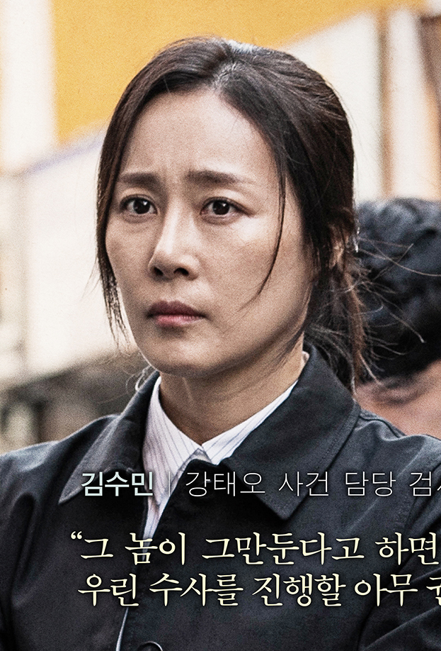 女检察官介绍:负责起诉姜泰伍杀害前女友案的检察官,因为金亨珉按姜泰伍的供述发现的死者衣物证明办案重案组伪造证据,让她在法庭上颜面丧尽。事后金亨珉再三提出证据试图证明姜泰伍提及的“暗数杀人案”存在,却均告失败,更令她一度怀疑金亨珉是为了立功而造假,但最终还是被金对正义的执着所打动。