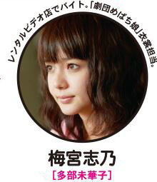 梅宫志乃介绍:25岁,对爱情有着依赖症,个人剧团“めばち娘”的服装师。和男友正树分手后,在好友的帮助下,她搬到一处新的公寓,展开全新生活。