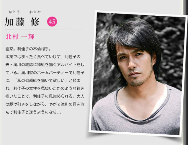 加藤修介绍:45岁,画家。利佳子的外遇对象。因为靠本行活不下去,只好为利佳子丈夫的杂志画插画。受利佳子之托帮她画肖像画,因画作仿佛看穿她的本性,而吸引到利佳子。