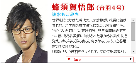 蜂须贺悟郎(音羽4号)介绍:世界级的天才诈骗师。校长亲自聘用的光学园的数学教师。3年b组导师。年少的时候很平凡,在儿童保育院长大。很久以前,有个诈骗犯给了他很多帮助,所以成为了诈骗师。天生的头脑,清爽的外貌和非常灵巧的骗术。