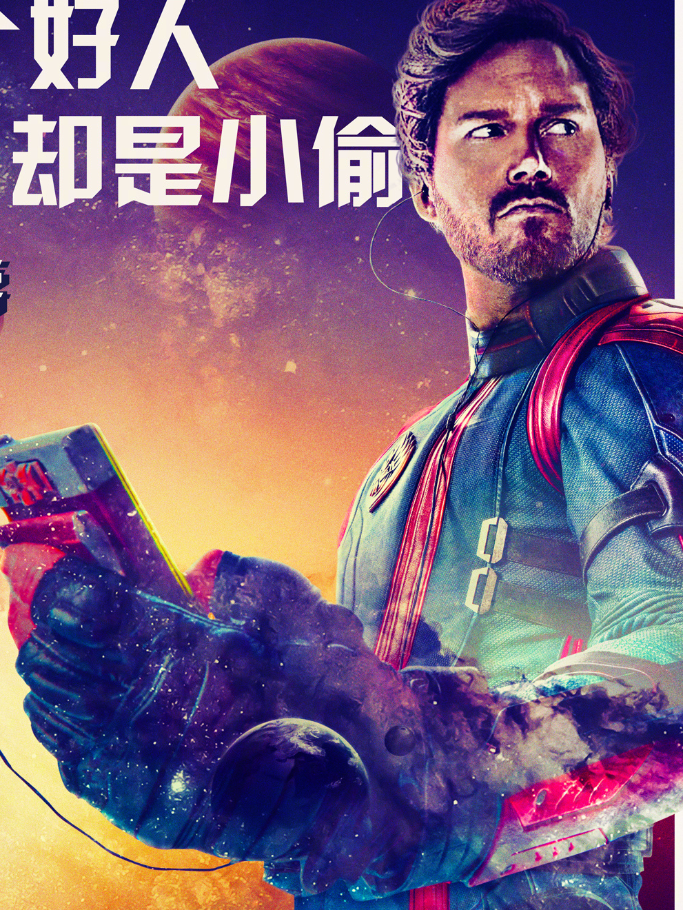 彼得·奎尔介绍:银河护卫队的领导者,喜欢听1980年代的地球音乐。他出生于1980年代的地球,还是个孩子时,母亲在他眼前病逝,接着他又被抓去了太空,自那时起就没再返回地球。他被勇度收养,与火箭、卡魔拉等人结成银河护卫队。在失去挚爱卡魔拉后他终日酗酒,在火箭被亚当重创时他没能相救,事后自责不已。